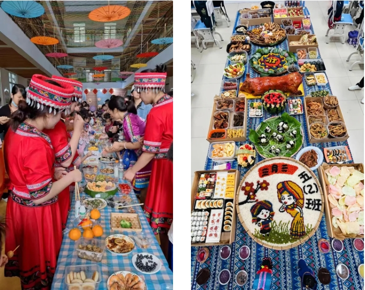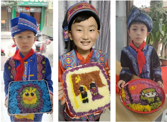“長(zhǎng)桌宴”又稱(chēng)合攏宴,是侗族、苗族、瑤族等多個(gè)民族的風(fēng)俗習(xí)慣,常用于接親嫁女、滿(mǎn)月酒、村寨聯(lián)誼等宴飲活動(dòng),代表最為隆重的待客禮俗,已有幾千年歷史。“長(zhǎng)桌宴”上有壯族特色的五色糯米飯、艾葉糍粑、壯粽,苗族的傳統(tǒng)佳肴,還有黎族的三色飯……一份份美食造型美觀、色彩鮮艷、香味撲鼻。圖為集團(tuán)職工拍攝的孩子參加學(xué)?!叭氯被顒?dòng)。